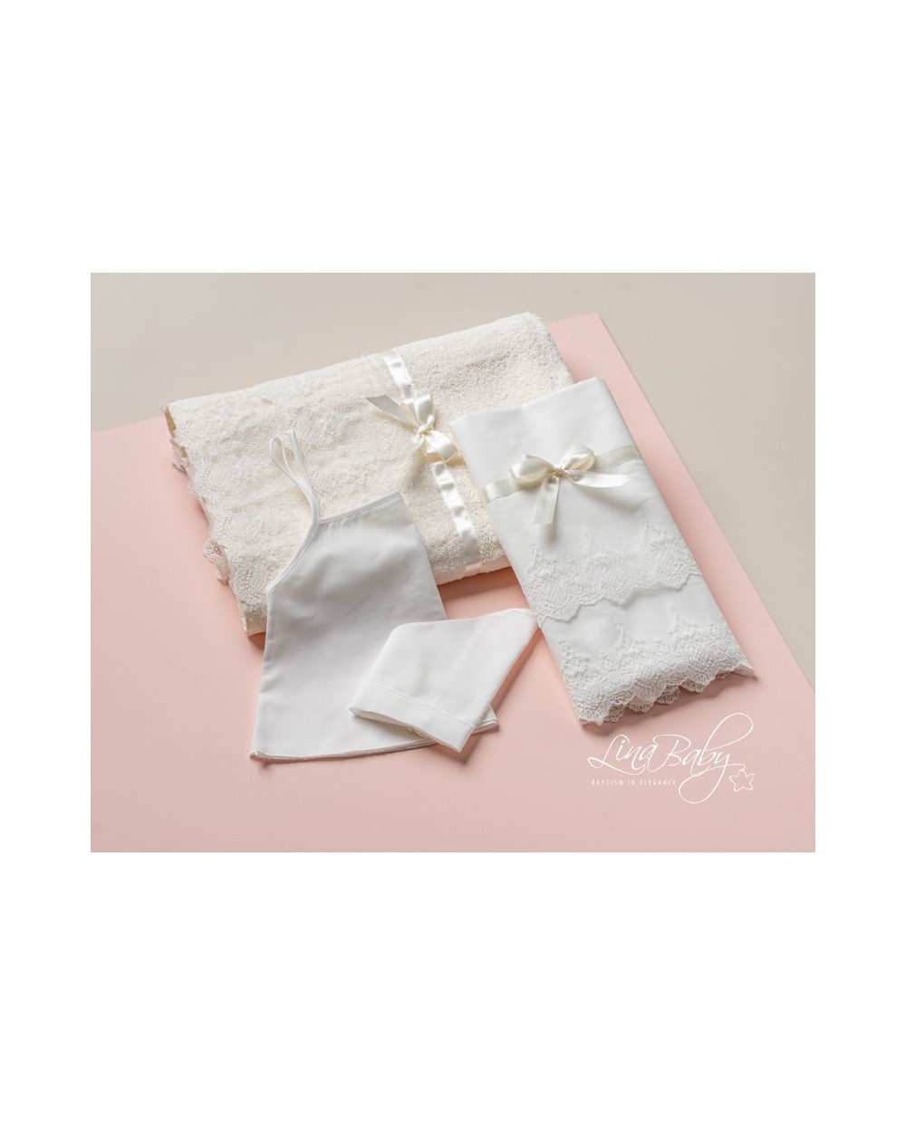 Σούπερ κομψό βαμβακερό σετ λαδόπανων σε εκρού χρώμα με ιδιαίτερη δαντελένια τρέσα, σατέν φιογκάκι και στρας.