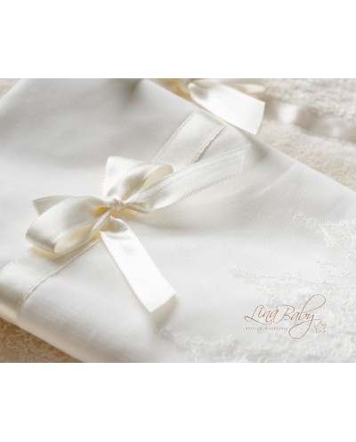 Ονειρικό βαμβακερό σετ λαδόπανων σε Ιβουάρ χρώμα με διπλές στρώσεις από Γαλλική δαντέλα και σατέν τρέσα στο τελείωμα του. Στην μέση του λαδόπανου διπλό φιογκάκι από εξαιρετικής ποιότητας σατέν κορδέλα.