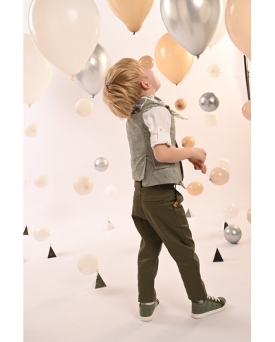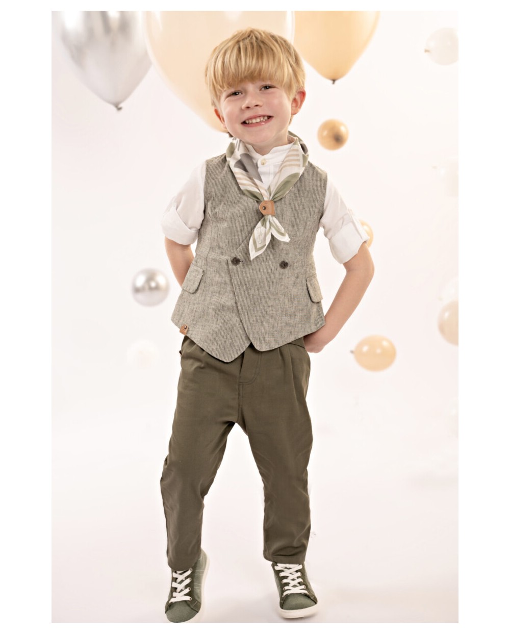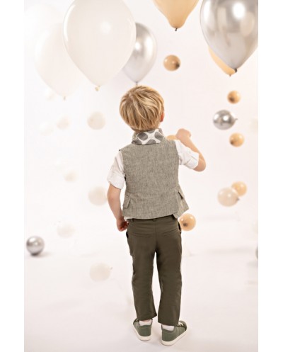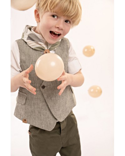 Ένα ιδιαίτερο σύνολο που αποπνέει κομψότητα και φρεσκάδα. Το δίπιετο παντελόνι με την έξτρα λοξή ζώνη σε λαδί βαμβακερή καμπαρντίνα δημιουργεί μια μοντερνα, αλλά κομψή γραμμή. Το μοναδικό αυτό γιλέκο, σταυρωτό, με τσέπες πατάκια και ασύμμετρο τελείωμα, σε χακί ψιλή-ρίγα από cotton-lino, προσφέρει μια μοντέρνα και φρέσκια προσέγγιση στην κλασική κομψότητα. Το βαμβακερό πουκάμισο σε off white απόχρωση με το ιδιαίτερο Mao γιακά φέρνει μια διακριτική και κομψή αίσθηση. Το personalized βουάλ φουλάρι με τα γεωμετρικά σχέδια σε μπεζ-λαδί αποχρώσεις προσθέτει χαρακτήρα, ενώ το ψάθινο καπέλο ή η τραγιάσκα (κατά επιλογή) αναδεικνύει άψογα το look.
