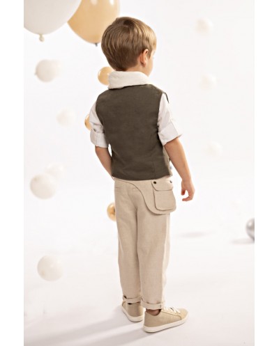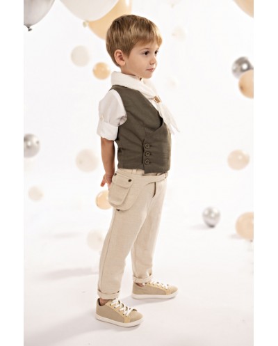 Ένα μοναδικό σύνολο με υπέροχες λεπτομέρειες που αναδεικνύουν την υψηλή ποιότητα και τη μοντέρνα αισθητική του. Το μπεζ παντελόνι σε ίσια γραμμή με την έξτρα αξεσουάρ ζώνη και την εξωτερική cargo τσέπη, φτιαγμένο από μελανζέ cotton-lino twill ύφασμα, προσφέρει έναν συνδυασμό πρακτικότητας και design. Το γιλέκο με μεγάλο σταύρωμα σε χακί Tencel-cotton-lino ύφασμα φέρνει την ιδανική ισορροπία σε αυτό το σύνολο, ενώ το βαμβακερό πουκάμισο σε off white απόχρωση με τον ιδιαίτερο Μao γιακά προσθέτει μία διακριτική, αλλά ουσιαστική πινελιά φινέτσας. Το φουλάρι από βαμβακερή υφαντή γάζα και το ψάθινο καπέλο ή η τραγιάσκα (κατά επιλογή) ολοκληρώνουν άψογα την εμφάνιση, προσφέροντας κομψότητα με χαρακτήρα.