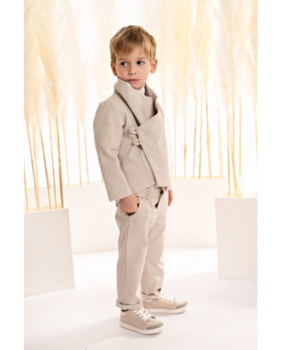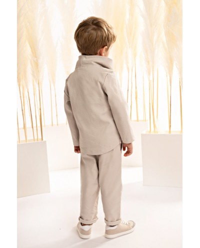 Αυτό το σύνολο είναι η επιτομή της casual κομψότητας. Το παντελόνι με διπλή ζώνη και λοξές τσέπες σε feather grey diagonal cotton-viscose ύφασμα αναδεικνύει τη μοντέρνα αισθητική. Το βαμβακερό πουκάμισο σε off white απόχρωση με τον ιδιαίτερο Mao γιακά προσφέρει μία κλασσική, αλλά ταυτόχρονα φρέσκια, αίσθηση, ιδανική για σύγχρονους συνδυασμούς. Η μακρυμάνικη ζακέτα με ντραπέ γιακά και λοξό κούμπωμα από γκοφρέ βαμβακερό διπλό ύφασμα σε feather grey απόχρωση προσθέτει πολυτελή αίσθηση στο σύνολο, συνδυάζοντας μοντέρνα και κλασσικά στοιχεία. Το ψάθινο καπέλο ή η τραγιάσκα ολοκληρώνουν ιδανικά το look, προσφέροντας μία αίσθηση άνεσης και κομψότητας που ακτινοβολεί. Ένα υπέροχο σύνολο που αναδεικνύει την εκλεπτυσμένη απλότητα.