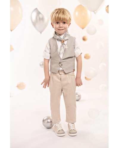 Μια πρόταση που ισορροπεί ανάμεσα στην κομψότητα και τη μοντέρνα αισθητική. Το δίπιετο παντελόνι, με την ιδιαίτερη λοξή ζώνη σε μπεζ βαμβακερή καμπαρντίνα, συνδυάζεται άψογα με το γιλέκο, το οποίο ξεχωρίζει χάρη στον λοξό μονό ωμίτη και το γκρι τσαλακωτό ύφασμα από modal. Το βαμβακερό πουκάμισο σε off white απόχρωση, με τον ξεχωριστό Μao γιακά, προσθέτει μοναδικό στιλ, ενώ το personalized βουάλ φουλάρι με τα λαχούρια σε μπεζ-γκρι αποχρώσεις και το ψάθινο καπέλο ολοκληρώνουν τέλεια την εμφάνιση.