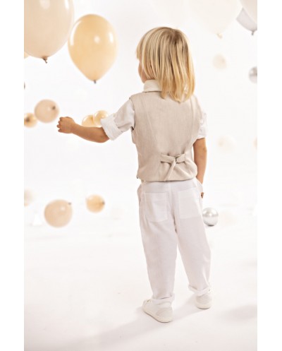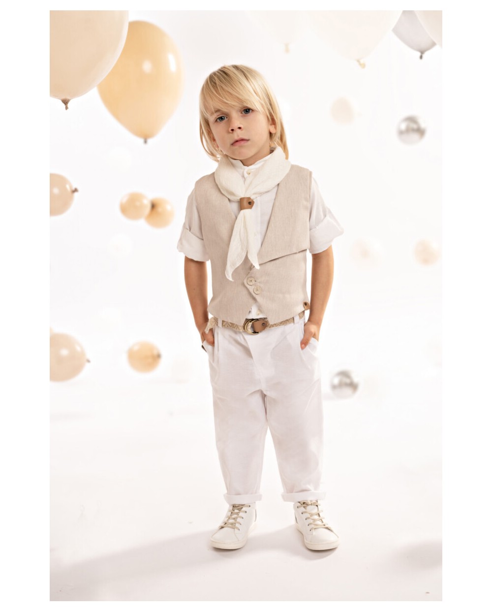 Ένα σύνολο που συνδυάζει την άνεση με τη μοντέρνα αισθητική. Το παντελόνι σε γραμμή baggy με λοξό κούμπωμα και εξωτερικές πίσω τσέπες, φτιαγμένο από λευκό tencel-lino-cotton ύφασμα. Το γιλέκο, με λοξό μονό ωμίτη από μελανζέ μαλακό τεχνικό diagonal ύφασμα, προσφέρει μια δυναμική και ταυτόχρονα κομψή αίσθηση. Το βαμβακερό πουκάμισο σε off white απόχρωση με ιδιαίτερο Μao γιακά ενισχύει τη φρεσκάδα του look. Το σετ ολοκληρώνεται με το φουλάρι σε off white απόχρωση από βαμβακερή υφαντή γάζα, ζώνη από υφαντό ιμάντα και το ψάθινο καπέλο (ή τραγιάσκα κατά επιλογή), προσφέροντας μία μοναδική επιλογή για τις ιδιαίτερες στιγμές σας.