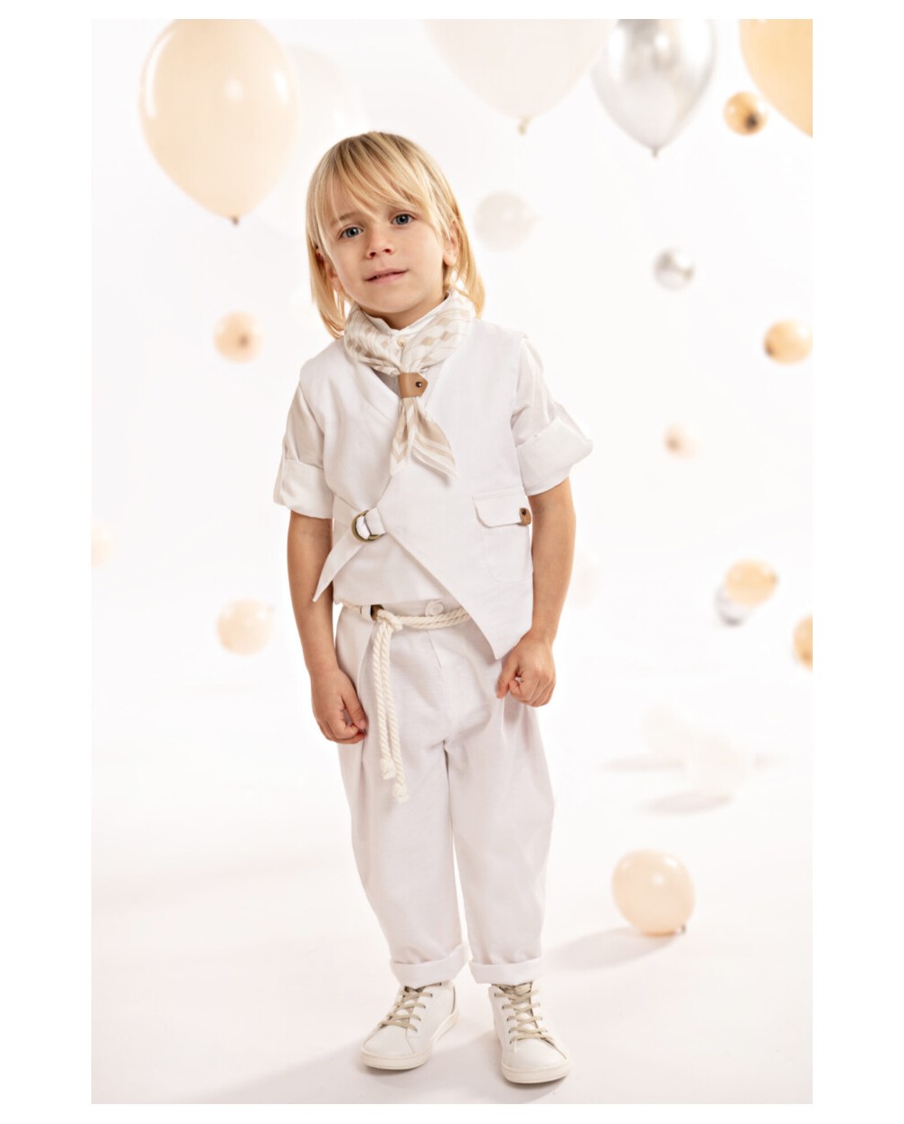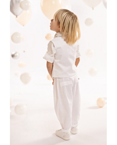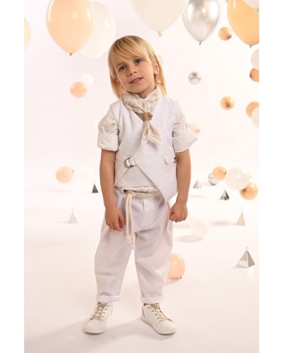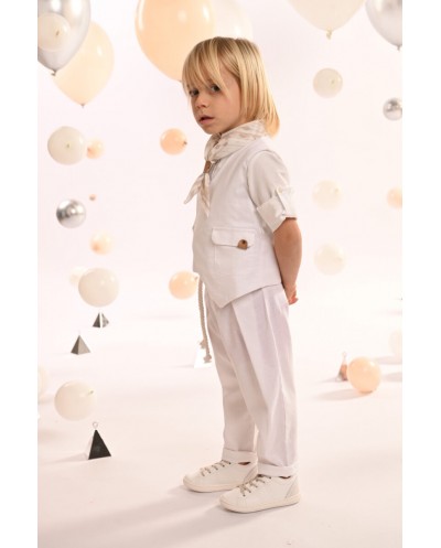 Ένα εξαιρετικό σύνολο από tencel-lino-cotton ύφασμα σε off white αποχρώσεις, το οποίο συνδυάζει το παντελόνι με τις ιδιαίτερες reverse πιέτες και το γιλέκο με ασύμμετρο κόψιμο και εξωτερικό τσεπάκι. Το βαμβακερό πουκάμισο σε off white απόχρωση ξεχωρίζει με τον ιδιαίτερο Μao γιακά. Το σύνολο ολοκληρώνεται ιδανικά με το personalized βουάλ φουλάρι με τα γεωμετρικά σχέδια σε μπεζ-λευκούς χρωματισμούς, την ζώνη από λευκό κορδόνι και το ψάθινο καπέλο (ή τραγιάσκα κατά επιλογή), προσφέροντας μια φυσική αίσθηση φρεσκάδας και μοντέρνας κομψότητας.
