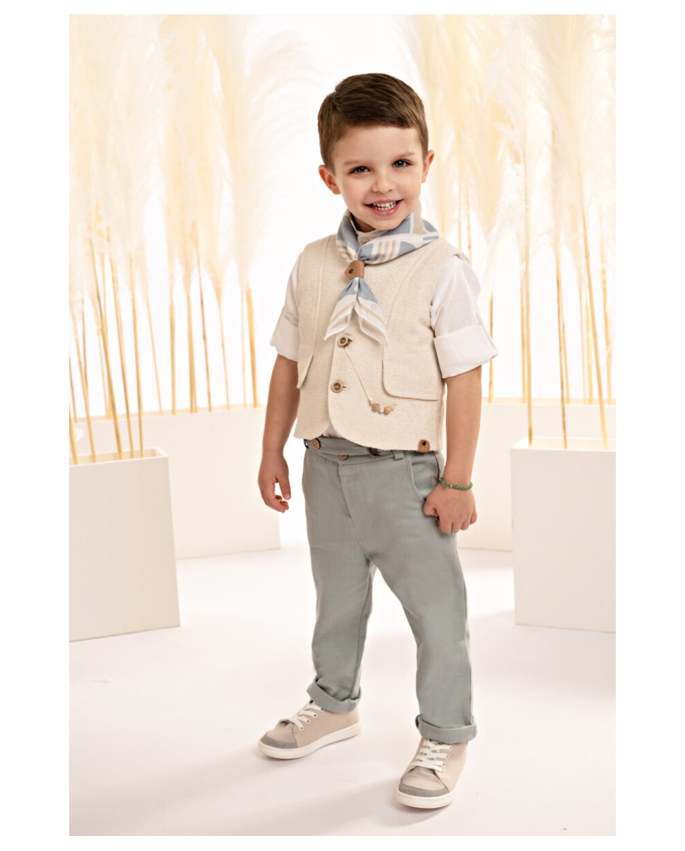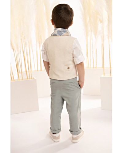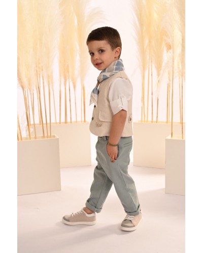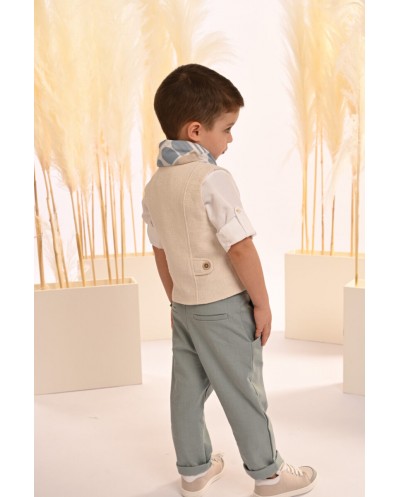 Ένα σύνολο γεμάτο φρεσκάδα με υπέροχο συνδυασμό χρωμάτων και υφών το οποίο αποτελείται από, παντελόνι με ιδιαίτερη λεπτομέρεια στο ζωνάκι από λινό σε mint χρώμα και γιλέκο σε κλασσική γραμμή με έξυπνα κοψίματα, φτιαγμένο από υπέροχο υφαντό ιταλικό ύφασμα σε εκρού απόχρωση. Το βαμβακερό πουκάμισο σε off white απόχρωση έχει έναν πολύ ιδιαίτερο Μao γιακά, ενώ το σύνολο ολοκληρώνεται άψογα με το personalized βουάλ φουλάρι με γεωμετρικά σχέδια σε μπεζ-σιέλ απόχρωση και το ψάθινο καπέλο (ή τραγιάσκα κατά επιλογή).