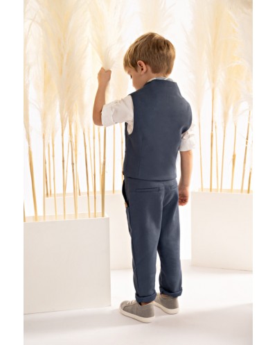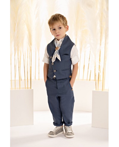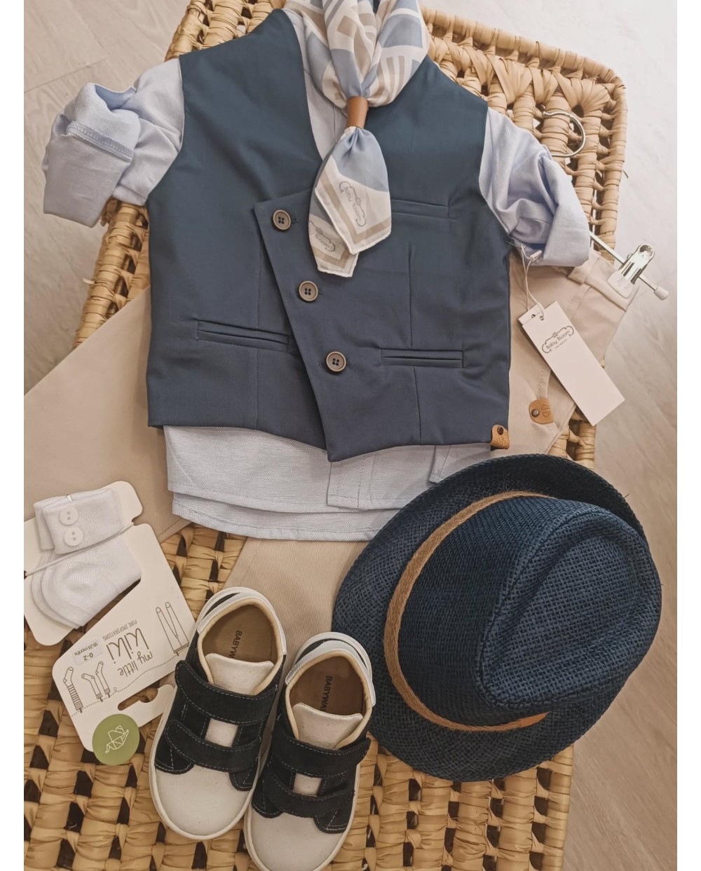 Ένα σύνολο με άψογη αισθητική, ιδανικό για μικρούς τζέντλεμεν! Σε αποχρώσεις του cobalt blue, το βαμβακερό καμβαδένιο παντελόνι διαθέτει ιδιαίτερη λεπτομέρεια στο ζωνάκι, ενώ το γιλέκο, με το λοξό κούμπωμα και τις τσέπες φιλέτο, προσδίδει σύγχρονη κομψότητα. Το βαμβακερό πουκάμισο σε off white απόχρωση ξεχωρίζει με τον ιδιαίτερο Mao γιακά του, προσφέροντας ένα σύγχρονο twist στο κλασικό ύφος. Το personalized βουάλ φουλάρι με γεωμετρικά μοτίβα σε σιέλ και μπεζ τόνους προσθέτει μια παιχνιδιάρικη πινελιά, ενώ η επιλογή ανάμεσα σε ψάθινο καπέλο ή κομψή τραγιάσκα ολοκληρώνει το look με στιλ και φινέτσα.