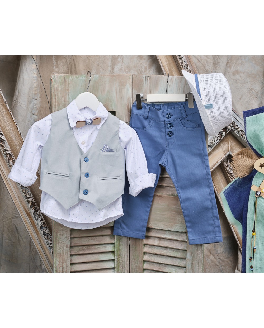 Αποτελείται από λευκό πουκαμισάκι με σχέδια με μακρύ μανίκι, βεραμάν απόχρωσης γιλέκο με γαλάζια κουμπιά και μαντιλάκι και παντελόνι καπαρτίνα ραφ με ρυθμιζόμενη μέση. Το σύνολο ολοκληρώνεται με ξύλινο παπιγιόν ή υφασμάτινο και λευκό ψάθινο καπελάκι με γαλάζια φάσα.