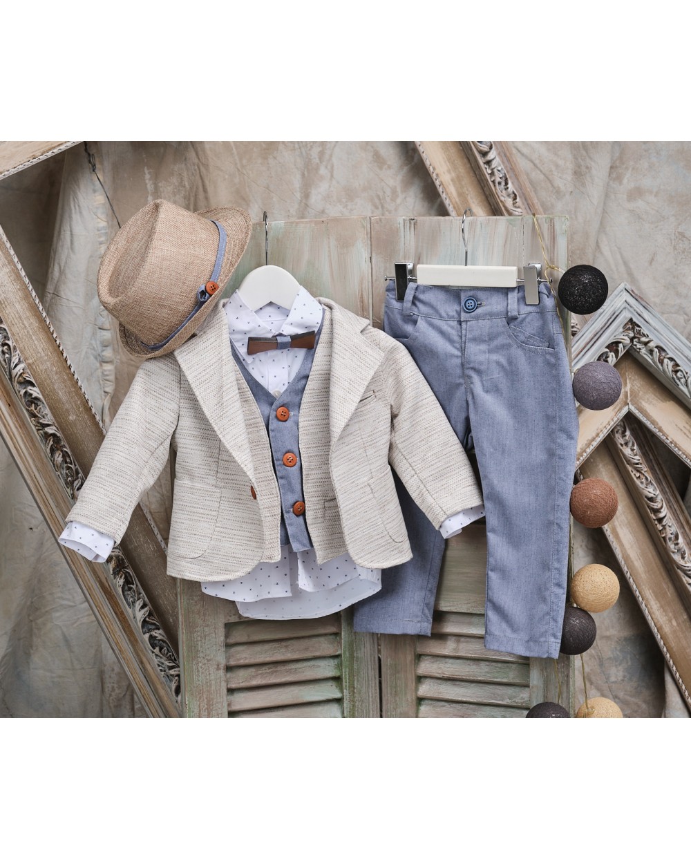 Ντύσιμο που μοιάζει κλασικό αλλά δεν είναι. Πάνω από το πουκάμισο με το διακριτικό μπλε σχέδιο, κυριαρχεί το τζιν ύφασμα στο παντελόνι με ρυθμιζόμενη μέση  και στην εσωτερική επένδυση του διπλού γιλέκου ενώ το μπεζ σακάκι του δίνει πιο επίσημο ύφος. Όλο το σύνολο ολοκληρώνεται από καφέ ψάθινο καπέλο με λεπτή, διακριτική τζιν φάσα, ζώνη και ξύλινο παπιγιόν σε πιο σκούρα απόχρωση.