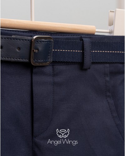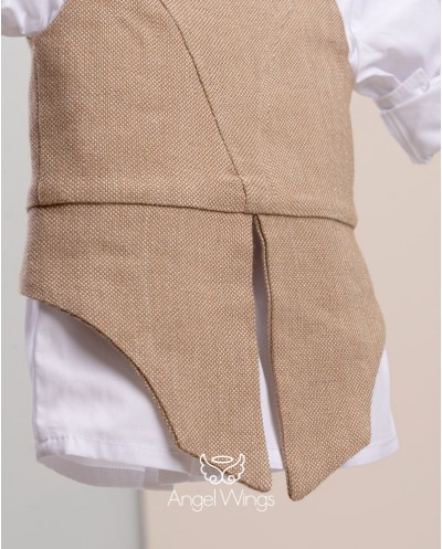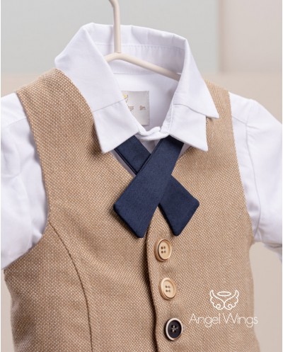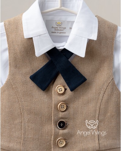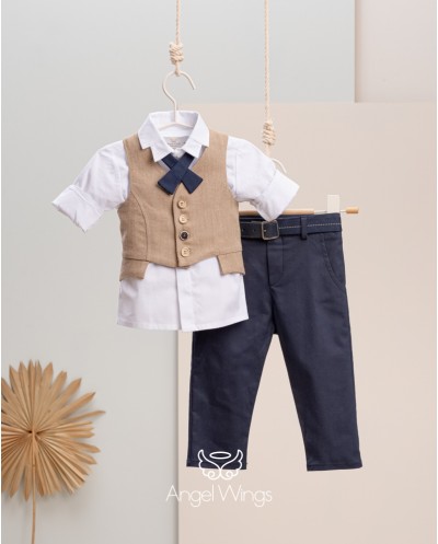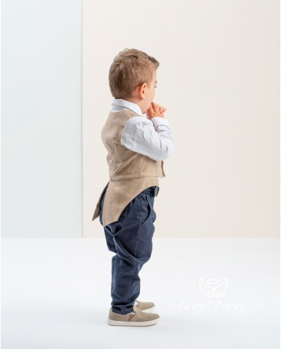 | Αυτό το ιδιαίτερο σχεδιαστικό σετ με πολλά ρετρό στοιχειά αποτελείται από 3 ρούχα και 3 αξεσουάρ. Παντελόνι μπλε navy από βαμβακερή ελαστική καπαρντίνα. Λευκό πουκάμισο από οργανικό βαμβάκι με πολύ ιδιαίτερο γιακά. Ασύμμετρο γιλέκο τύπου φράκο από ιταλικό ύφασμα μελανζέ στους τόνους της άμμου, με 4 κουμπιά και ουρά πίσω. Το όλο σετ συνδυάζεται με ζώνη ιμάντα μπλε, παπιγιόν στυλ continental και ψάθινο off white καπέλο ή τραγιάσκα. Προτείνεται το λαδόπανο της εταιρείας Lina Baby ESS1451 |