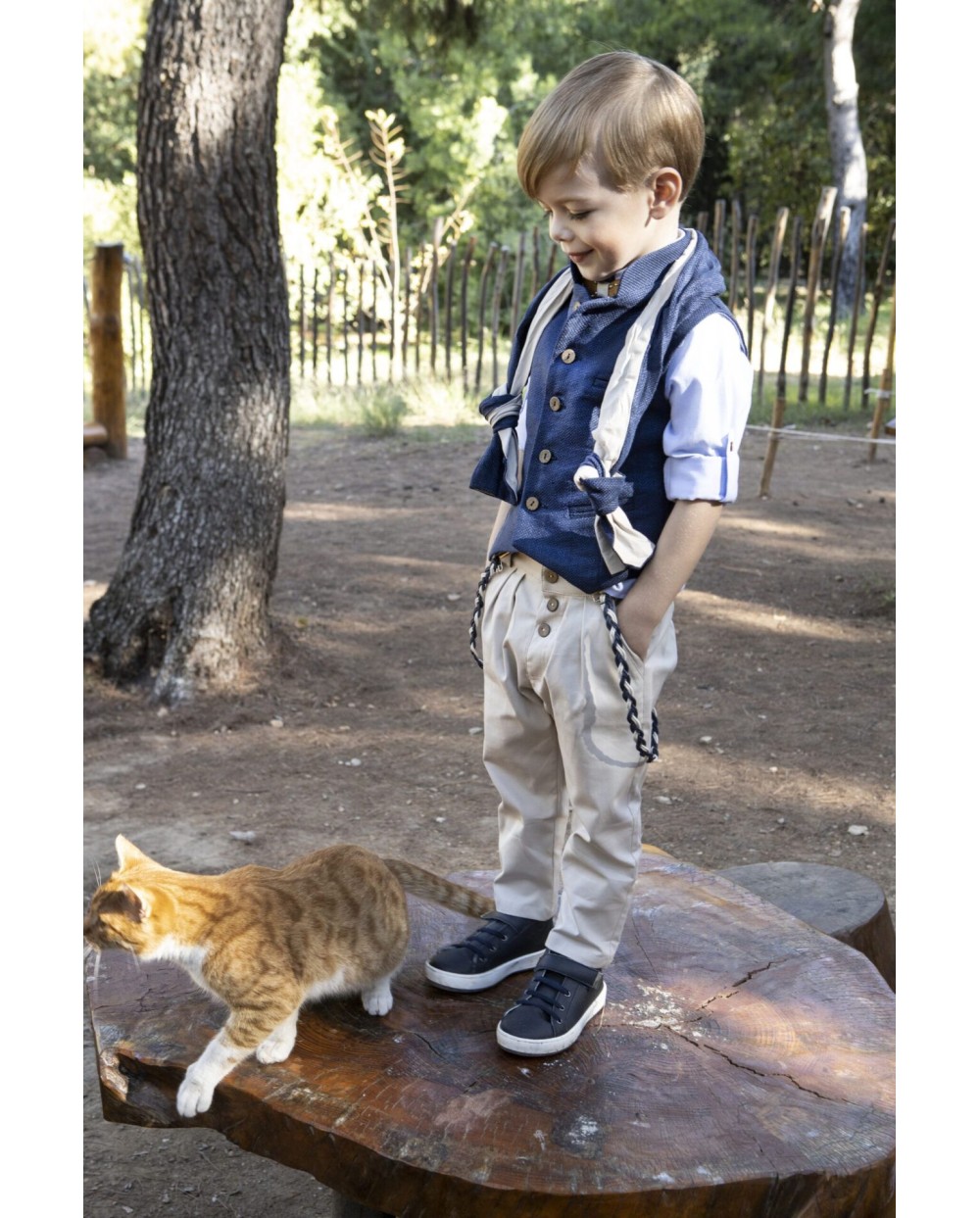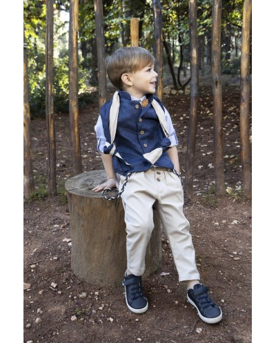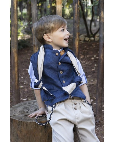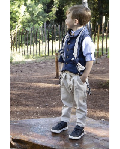 Σετ βάπτισης Baby Bloom της συλλογής Printemps 2023 σε αποχρώσεις μπλε- σπαγγί. Το σετ περιλαμβάνει γιλέκο μπλε ανάγλυφο με μάο γιακά, πουκάμισο σε σιέλ απόχρωση και παντελόνι μπεζ καμπαρτίνα με πιέτες, τιράντες ,ξύλινο παπιγιόν ,δίχρωμο φουλάρι και ψάθινο καπέλο ή μπερές.