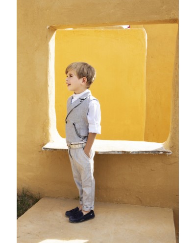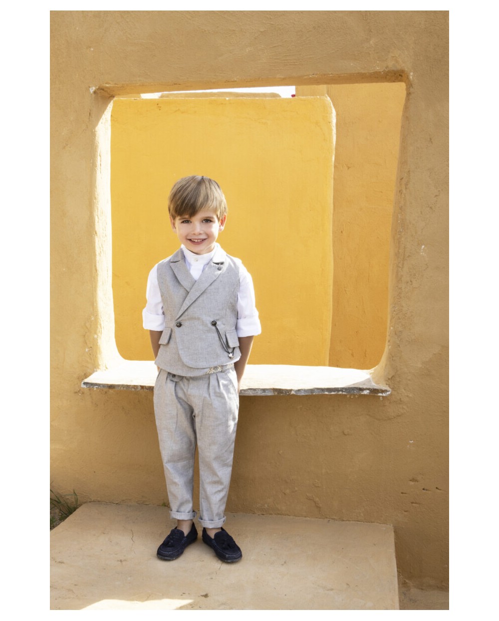 Ιδιαίτερη πρόταση της Baby Bloom από την συλλογής stile di vita mediterraneo 2024 σε γκρι αποχρώσεις. Αποτελείται από γκρι λινό γιλέκο με εντυπωσιακό κούμπωμα και στόλισμα, λευκό βαμβακερό πουκάμισο και παντελόνι γκρι λινό πιέτες. Στο σετ περιλαμβάνονται επίσης ζώνη και ψάθινο καπέλο ή μπερές.