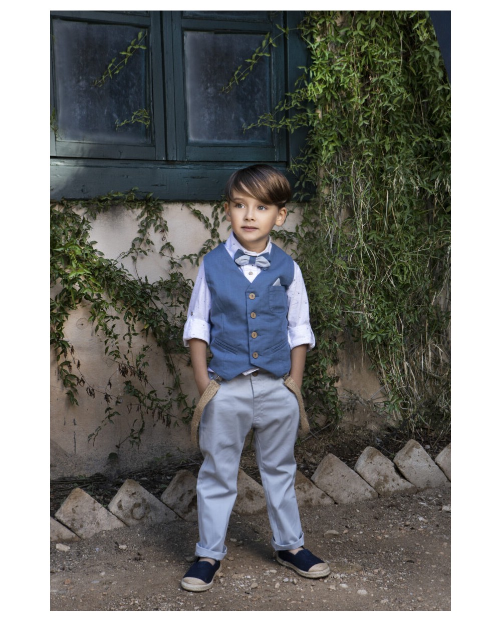 Μια πολύ ξεχωριστή πρόταση Baby Bloom της συλλογής stile di vita mediterraneo 2024 σε αποχρώσεις μπλε ραφ και σιέλ. Σετ βάπτισης 7 τεμαχίων που περιλαμβάνει παντελόνι σιέλ καπαρντίνα, πουκάμισο λευκό με ιδιαίτερο print και γιλέκο μπλε ραφ λινό. Στο σετ περιλαμβάνονται επίσης τιράντες, υφασμάτινο παπιγιόν και ψάθινο καπέλο ή μπερές.