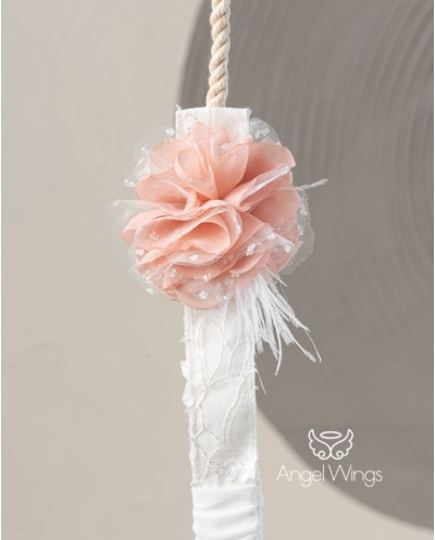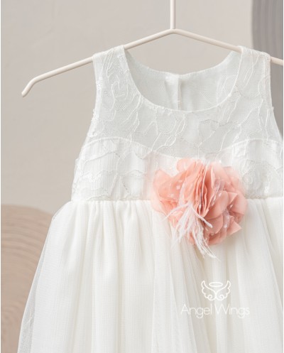 Αυτό το αμπίρ φόρεμα σε χρώμα off white σίγουρα θα σας κερδίσει με την μοναδική φινέτσα του. Το μπούστο είναι φτιαγμένο από φίνα γαλλική δαντέλα με διάφανες παγιέτες και ντουμπλαρισμένο μπούστο. Η διπλή φούστα από μαλακό τούλι και ιριδίζον  μουσελίνα έχει  βολάν από τούλι πουά.  Το ρούχο στολίζεται στο στήθος με χειροποίητο  λουλούδι σε αποχρώσεις του σάπιου μήλου για να κάνει αντίθεση με το χρώμα του υφάσματος. Το ρούχο είναι φοδραρισμένο από βαμβακερό ύφασμα. Συνδυάζεται με κορδέλα για τα μαλλιά διακοσμημένη με χειροποίητο λουλούδι κ φτερά, ασορτί με το ρούχο.