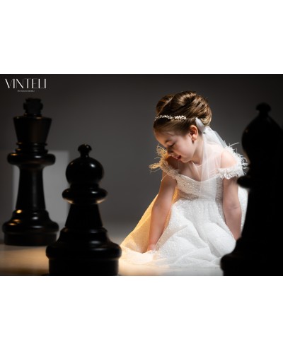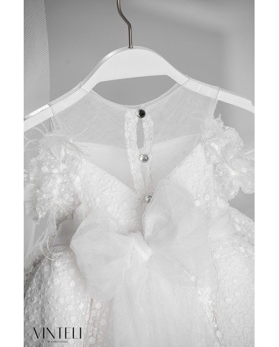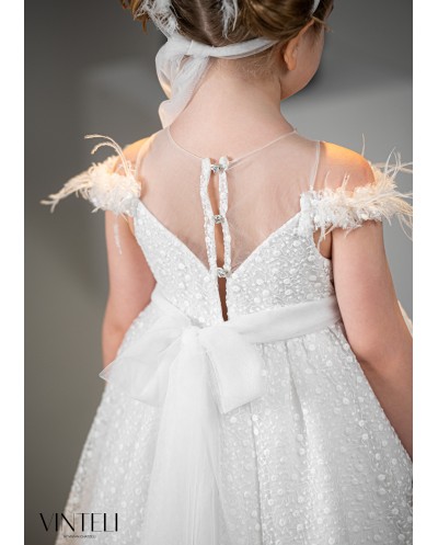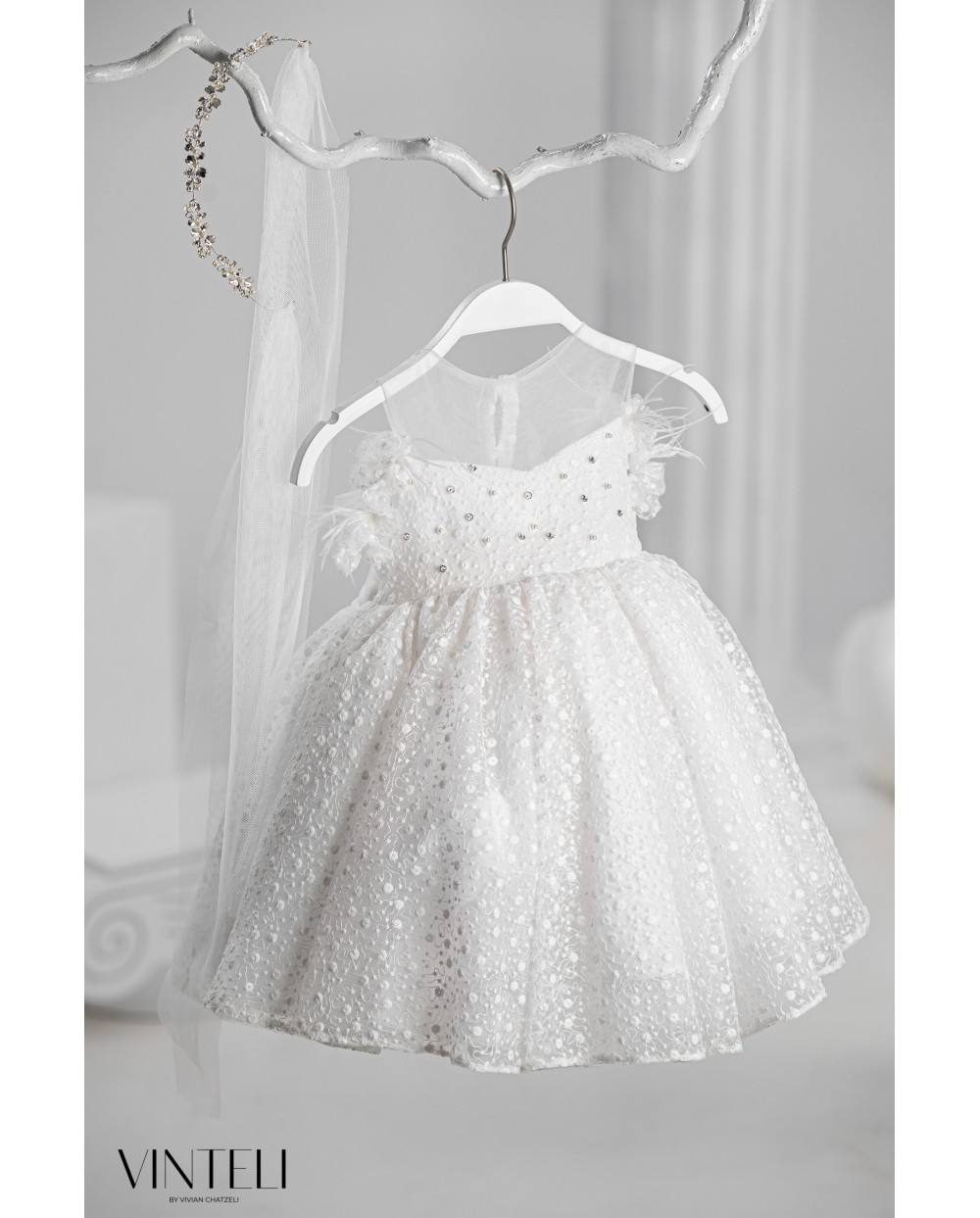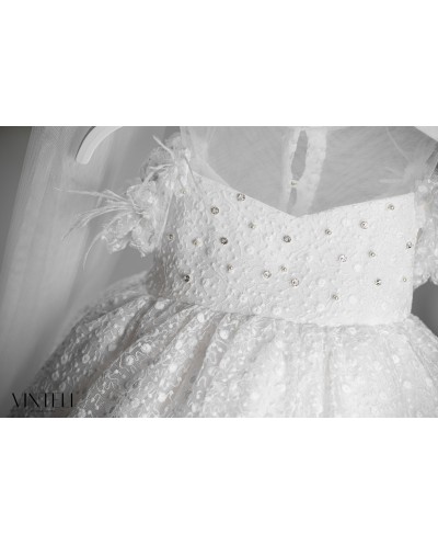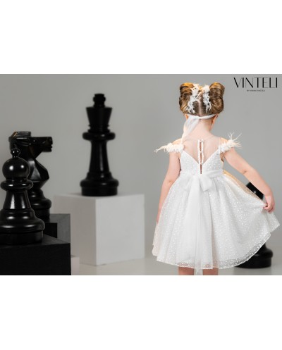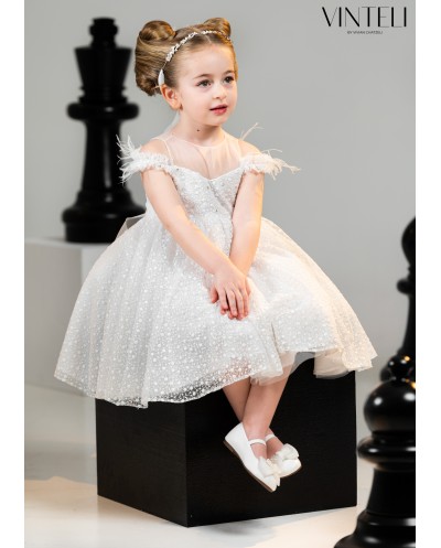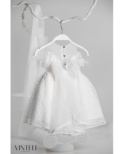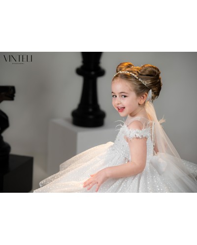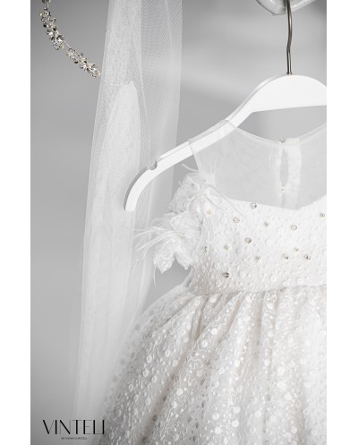 Φόρεμα μεσάτο λευκό από δαντέλα με διαφάνεια στο πάνω μέρος κρατώντας σχεδόν ακάλυπτους τους ώμους, στολίζεται με φτερά και με λεπτομέρειες από την ίδια δαντέλα. Το φόρεμα διακοσμείται με κεντημένα swarovski και πέρλες στο μπούστο και τούλινη ζώνη με φιόγκο στο πίσω μέρος. Συνοδεύεται από μεταλλική τιάρα στολισμένη με τούλι στα τελειώματά της. Σετ 2 τεμαχίων.