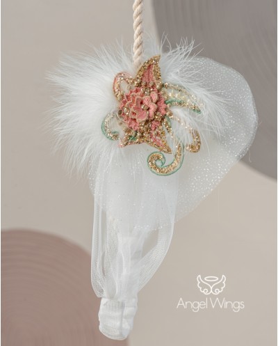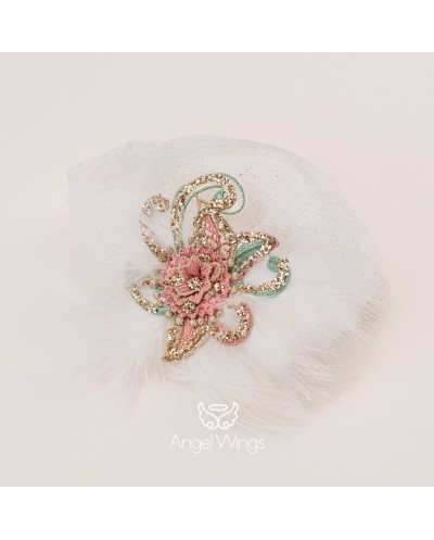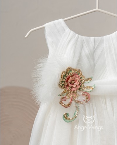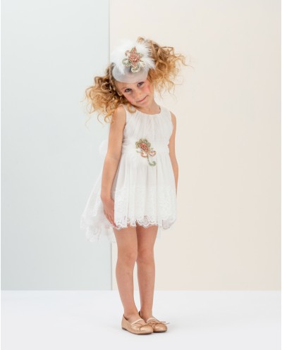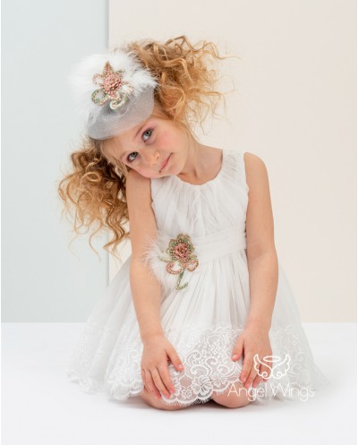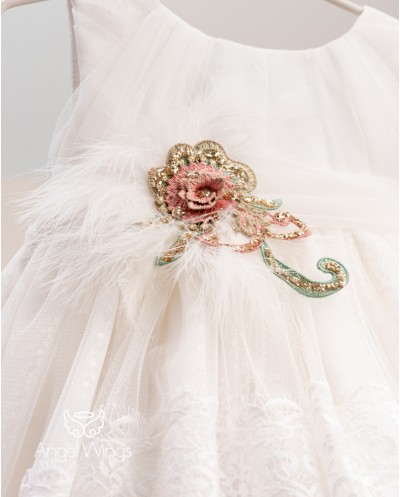 | "Fedra" Ένα μοναδικά πανέμορφο ασύμμετρο φόρεμα εμπνευσμένο από το Moulin rouge. Αμάνικο ντραπέ μπούστο από μαλακό off white τούλι απλικαρισμένο με πουά γκλίτερ τούλι. Η σουρωτή ασσύμετρη φούστα από μαλακό τούλι έχει γαλλική δαντέλα στο τελείωμα και καταλήγει σε εντυπωσιακή ουρά στο πίσω μέρος. Η ντραπέ ζώνη από μαλακό τούλι στολίζεται με απλικέ κεντημένα χρυσά-ροζ- μέντα φλοράλ μοτίβα και φτερά σε εκρού χρώμα. Το σύνολο ολοκληρώνει άψογα η κορδέλα-τουρμπάνι από τούλι με ασορτί στόλισμα για το κεφάλι. |