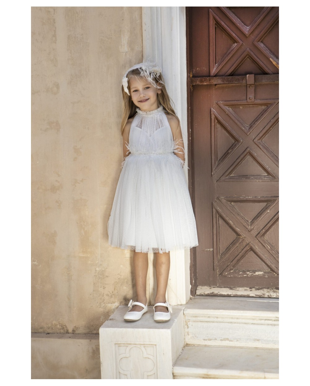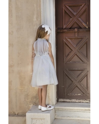 Νεραϊδένιο φόρεμα βάπτισης της συλλογής Printemps 2023 ,σε ιβουάρ απόχρωση με διαφάνεια και V στο μπούστο που καταλήγει σε μια πιο λιτή φούστα από τούλι σε γραμμή άλφα και διαφάνεια στην πλάτη. Ιδιαίτερο χαρακτηριστικό του φορέματος είναι η εντυπωσιακή τρέσα με κρυσταλλάκια και πούπουλα maraboo που στολίζουν την μέση και το λαιμό του φορέματος. Εσωτερικά υπάρχει επένδυση από μαλακό βαμβακερό ύφασμα .