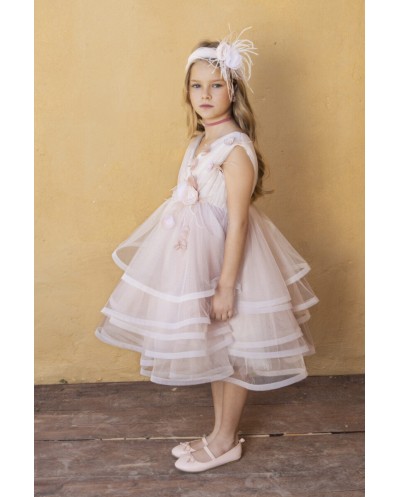 Ένα παραμυθένιο φόρεμα βάπτισης Baby Bloom της συλλογής stile di vita mediterraneo 2024 σε ροζ παστέλ χρώμα για σύγχρονες πριγκίπισσες με μοναδικό design. Χειροποίητα λουλούδια και πούπουλα marabou στολίζουν την μέση του φορέματος και το ιδιαίτερο ντραπέ μπούστο. Ιδιαίτερο χαρακτηριστικό η τούλινη φούστα με ασύμμετρα τούλια που χαρίζουν αέρινη κίνηση. Η εσωτερική επένδυση του φορέματος αποτελείται από μαλακό βαμβακερό ύφασμα.