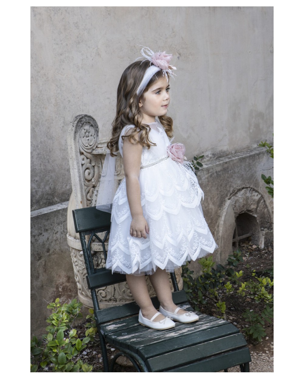 Εντυπωσιακό φόρεμα βάπτισης υψηλής ραπτικής Baby Βloom της συλλογής stile di vita mediterraneo 2024 σε off white απόχρωση με εσωτερική επένδυση από μαλακό βαμβακερό ύφασμα. Διπλή απλικέ δαντέλα στο κορσάζ του φορέματος που συνεχίζει κ στην φούστα. Την μέση του φορέματος στολίζει δαντέλα με στρας και μια σύνθεση από χειροποίητα λουλούδια.